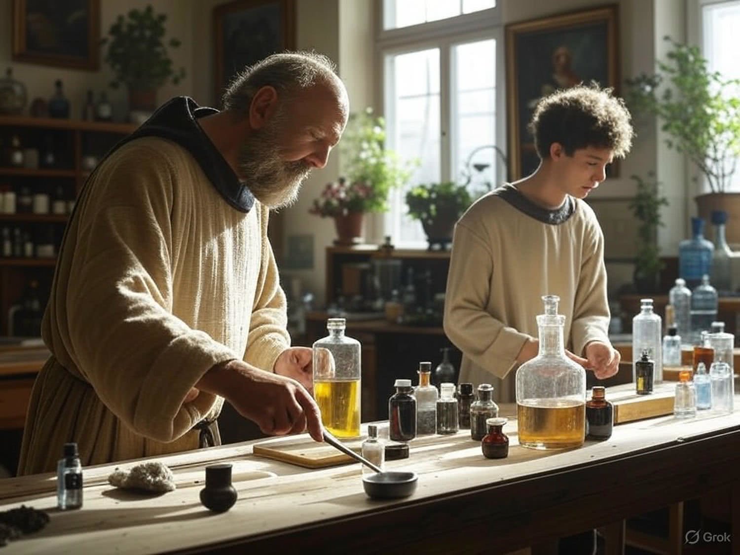 Ilustracja przedstawiająca renesansowego alchemika i perfumiarza pracujących razem w laboratorium, otoczonych przez różne rośliny, minerały i butelki z esencjami zapachowymi. W tle widoczne są obrazy i poezja, które podkreślają związek między sztuką a perfumerią.